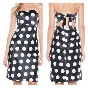 NWT Bardot Sayer Navy and White Satin Dotted Tie Back Strapless Dress. No flaws. Size 4. Armpit To Armpit 16 inches. Shoulder To Hem 32 inches.