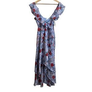 Bardot, floral high-low dress, blue cold shoulder dress, women's summer dress, ruffle sleeve dress, polyester dress, Australian brand dress, Bardot AUS 8, lightweight floral dress, high-low hemline, NWT Bardot Women's Dress, Floral High-Low Dress, Cold Shoulder Dress, V-Neck Dress, Blue Floral Dress, Bardot AUS 8 Dress, Women's High-Low Dress, Summer Party Dress, Elegant Floral Dress, Boho Chic Dress.