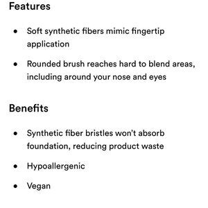 Vegan foundation brush with dense, tapered fibers which mimics the shape of your fingertips.