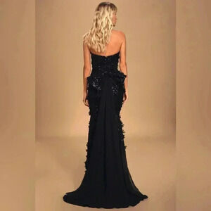 White mesh fabric (atop a satin liner) is decked out with white sequins in an allover abstract design, and three-dimensional floral appliques as it shapes a strapless, sweetheart neckline (with no-slip strips) and a padded, princess-seamed bodice with hidden, supportive boning. A high, empire waist falls to a figure-hugging mermaid skirt with a high-low hem. A removable fitted belt (with hook/clasp closure) features an oversized bow accent and chiffon panel that can be worn at the front or back. Hidden back zipper/clasp.
