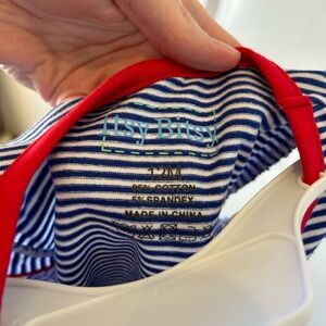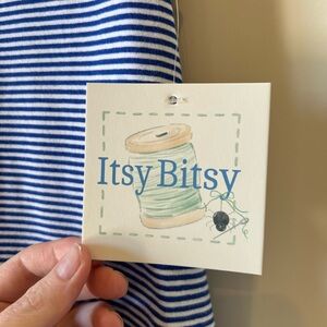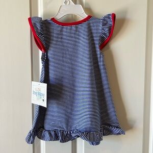 So precious!!! Perfect for baby sister to cheer on big brother at the ball field! New with tags flutter dress with embroidered baseball design with bow. Blue and white stripes and red trim. Brand is itsy bitsy. Size 12 months. Would also be great for braves or Fourth of July / 4th of July!