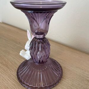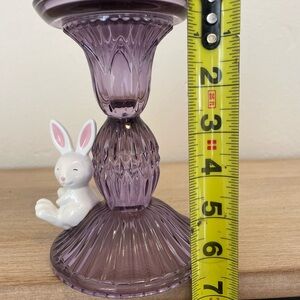 Charming lavender glass holder with a cute white rabbit accent. Adds a playful touch to any room. Brand new price reflects availability. Excellent condition. Single wick candle holder. Measurements posted in photos.