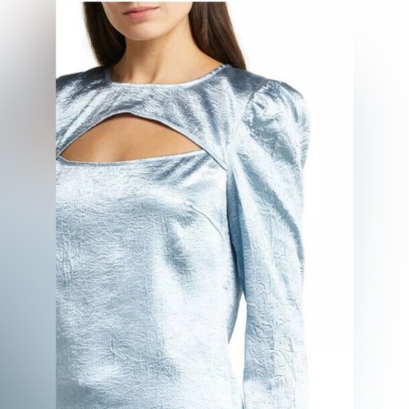 NWT Baum and Pferdgarten Marcy satin light blue mist blouse. Cut out in front, satin fabric, women’s size 36, which is a 6 US. Partial tags.