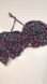 A retro/70s style halter swim top, has an adjustable halter tie string, has a denim-like pattern, has the cutest cherry print throughout, scallop-shaped and non-padded cups, no underwire, white trim along the cups, has boning on the sides, ruffles on the bottom, and an adjustable/stretchy back hook and eye closure with velcro.
