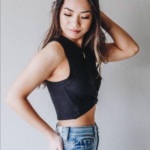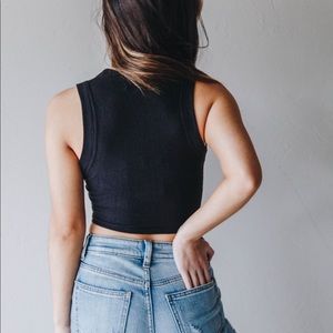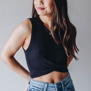The Beach Riot Marissa Crop is a black cropped tank top featuring a high-neckline and a twist detail along the front hem. So soft and flattering! Pair with anything from leggings to jeans to joggers to complete the look.