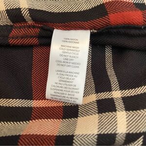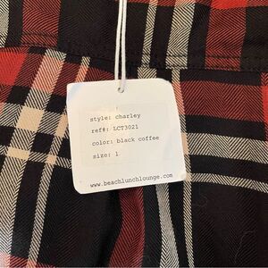 Stylish plaid button-up shirt with a classic collar from Beachlunchlouge. Super soft and comfy 100% rayon material. Features a chest pocket and long sleeves. Pair with your favorite jeans for a casual Western look. The style is "Charley" and the color is "Black Coffee", which features shades of black with red and tan. Comes with an extra button sewn onto the label. Originally retailed for $58.