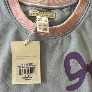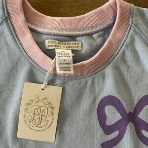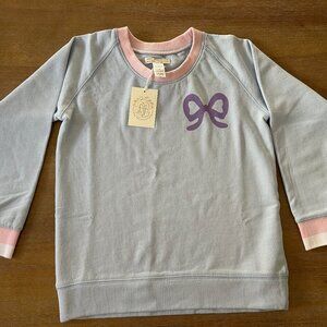 NEW with tags. Beaufort Bonnet Company "Cassidy comfy crewneck" sweatshirt in light blue with pink and white accents and purple bow design at left upper chest. Size 8 years. MSRP: $54.
