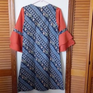 Brand new Batik dress bought in Thailand. Very elegant. Size Medium but the fabric stretch so it could fit Large as well. Midi length below the knee. Slip on with small button in the back. Bell sleeve 3/4 length. Fabric is soft cotton very comfy. Accessories with belt must look great but loose fit is fine too. Great dress for any occasion. Ready to wear. Thanks.