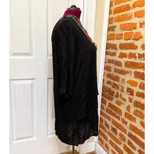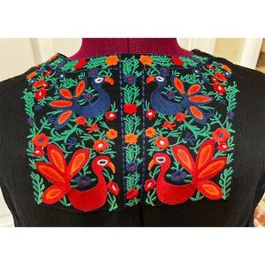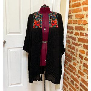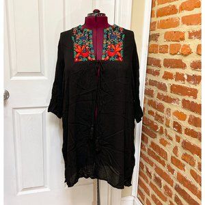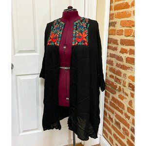 NWT Velzera top, size 3x. Mid-length flowy black gauze boho maxi-top duster. Beautiful bird embroidery in green, blue, red, orange, and white on front & back yokes. Single tassel tie in front. Wear open or closed. 3/4 length sleeves. 100% rayon.