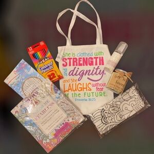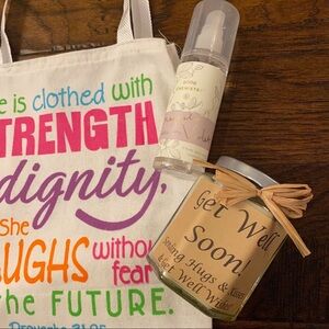NWT! Beautiful and Thoughtful Get Well Soon Gift. This is a hand picked, very thoughtful 7 Piece Get Well Soon gift. It includes the following: Sending Hugs and Kisses and Get Well Wishes scented candle, Magnolia Violet Good Chemistry body spray, Color Me Fearless coloring book, 12 colored pencils, Adult Coloring Pencil Storage Roll, Chicken Soup for the Soul Inspirational Word-Finds, Linen bag with inspirational quote.