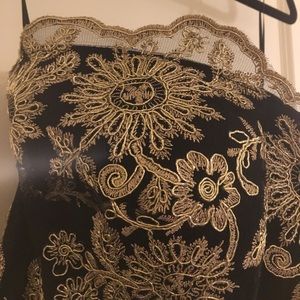 Gorgeous cocktail dress gold with black design. Purchased for wedding but never worn. Will compliment any figure!!