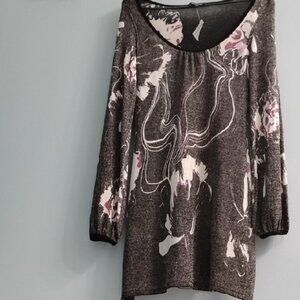 Elegant long sleeve dress by bebe. Features a black base with pink floral patterns. Perfect for any occasion.