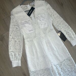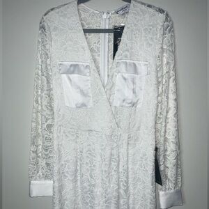 NWT Bebe Utility Lace Boho Jumpsuit, satin cuffs and chest pockets, v-neck lined through shorts, back zipper with hook closure. *missing belt shown*