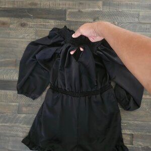satin, ruffled, off-shoulder, bell sleeves, black, silky, romper, elastic waist, thigh-length, pocket details
