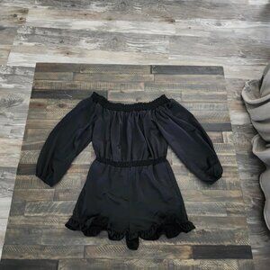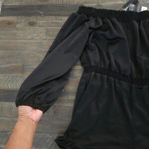 NWT Bebe - Jet Black Satin Off The Shoulder Ruffled Hem Romper size Medium