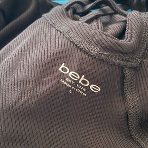 Stylish black sleeveless top by Bebe. Features button detail and criss-cross back design.