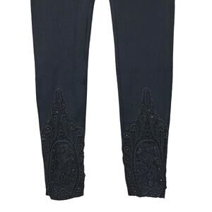 Bebe Magnolia Frost Royalty Leggings in black size small. Soft and smooth knit leggings with an elastic waistband. Lace embroidery with rhinestones at front bottom of each leg with a side zip. Brand new with tags! 60% rayon, 35% nylon and 5% spandex. Measurements: inseam- 28 inches and Waist (laying down flat)- 13.5 inches.