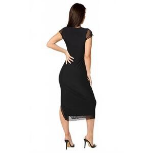 This elegant black midi dress features a sleek, form-fitting silhouette with delicate mesh cap sleeves and hem detailing.
