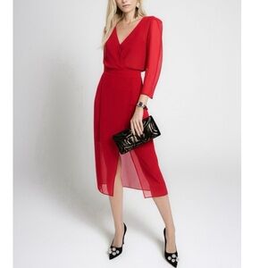 NWT Bebe Womens Raspberry Pink Chiffon Faux Wrap Midi Dress 3/4 Sleeve Size 4