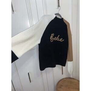 Keywords: bebe sweater, XL pullover, women's multicolor sweater, mock neck sweater, long sleeve sweater, raglan sleeve, acrylic nylon blend, fall fashion, casual wear, machine washable sweater, new with tags, women's fall sweater, China made sweater, solid pattern sweater, regular fit sweater.