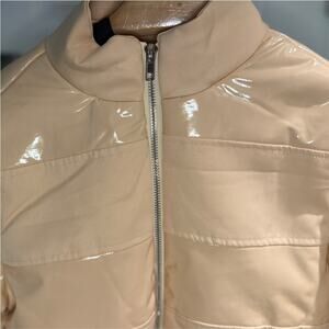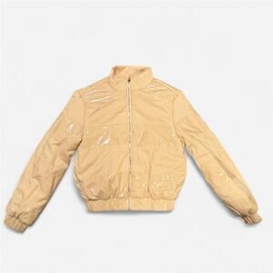 Stylish beige puffer jacket with a glossy finish. Perfect for a chic look.