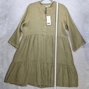 NWT Bellambra Italy Linen Dress M Olive Babydoll Tiered Roll Tab Oversized