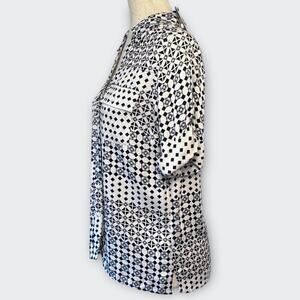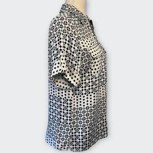 This new w/ tags BELLDINI has a collared V-neck, short sleeves with roll-up tabs, a button-down front and two chest pockets w/ buttons. It's silky feeling rayon fabric features a black and light blue square and diamond pattern on a white background creating a visually striking design. This is a perfect blouse for the office or casual occasions.