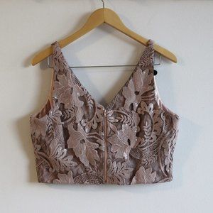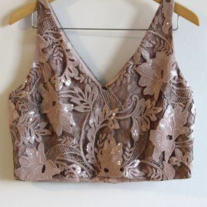 This is a great set! Both pieces are fully lined and have zippers at the back. The colors on the tags are Blush/Mauve. The top has sequins and black lace over a satin layer. The skirt has a lovely slit on the left-hand side and pockets! Never worn, New with Tags. Needs a quick steam to release the wrinkles but otherwise perfect!