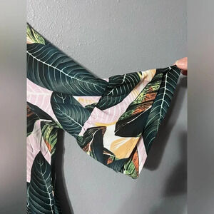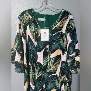 NWT Belongsci Green Tropical Floral Leaf Shift Dress Size XL Bell Sleeves Lined. Measurement from shoulder to hem 38 inches. Sleeve opening to shoulder seam. 16 inches. Armpit to armpit laying flat 22.5 inches.