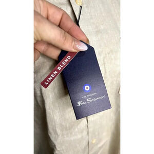The Ben Sherman Men's Button-Up Shirt in size M features a regular fit and short sleeves. Made from a lightweight, breathable linen blend, it is ideal for casual summer occasions. The shirt is beige with a solid pattern and has a spread collar and button closure. It is machine washable and new with tags (NWT). Suitable for casual outings and summer events. Keywords: Ben Sherman, men's shirt, button-up, short sleeve, beige, linen blend, casual, summer, lightweight, breathable, spread collar, machine washable.