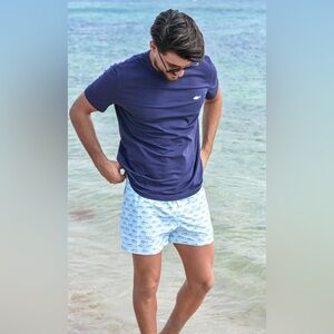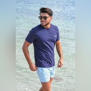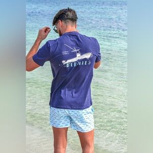 Bermies graphic tee in navy, featuring a back print of a boat and ocean coordinates, with the Bermies logo below. Made from high-quality organic cotton with 5% spandex for added stretch. Ultra-soft, breathable, and sweat-wicking—perfect for sunny days or post-swim lounging.