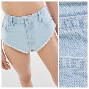 Bundle any 2 items marked 🌹 for $45! NWT. Bershka Light Blue High Waisted Five Pocket 80's Denim Shorts with frayed hem, front zipper and metal button closure. Size 8. Ref. 2570/969. Waist 14,5" flat, rise 12,5", inseam 1,5".1055