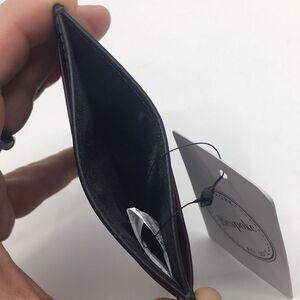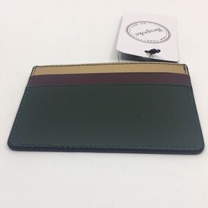 Bespoke color block card wallet. New with tags. I love the minimalist style of this wallet and it’s so nice and compact. But the tricolor gives a pop of interest to this great little piece. Unisex wallet. Dark green, burgundy, and a deep mustard color. Two card slots on either side and then the top section is open for additional cards. Great compact piece for on the go or for a smaller Crossbody bag. No flaws. Measurements in photos.