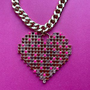 NWT Betsey Johnson Heart Necklace - Pink & Red Rhinestone Pixelated Heart on Short Thick Gold Chain