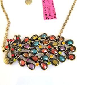 NWT Betsey Johnson Necklace Women's Peacock Multicolored Gem Stone Gold Tone
