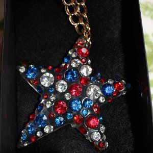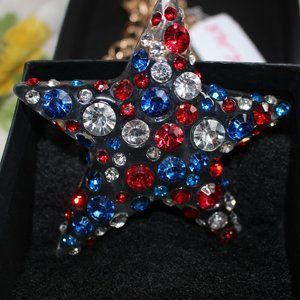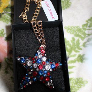 NWT Betsey Johnson Patriotic Pendant Necklace Red White & Blue Star Faux Jewels