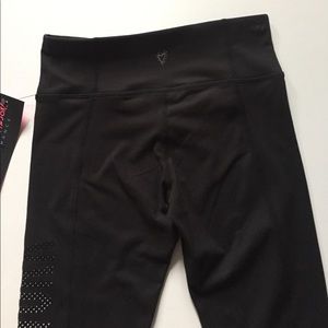 New. Black/White Combo Work Logo Crop Leggings. Moisture wicking soft jersey knit. Wide elasticized waistband with inner coin pocket. Stretch. Flat seaming. Black with white Work Logo down leg. Size XS. 83% polyester, 17% spandex. Waist about 23", rise about 9", inseam about 19.5". M10