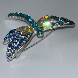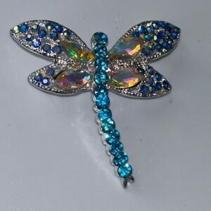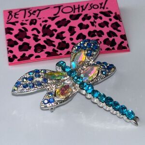New with tags Betsey Johnson beautiful crystal dragonfly brooch. Exquisite detail with crystals in different shades of blue and the wings have 4 large faux aurora borealis stones
