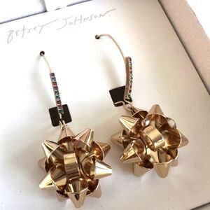 NWT Betsey Johnson Wrap Me Up Gold Christmas Bow Holiday Earrings Rhinestone Pav