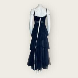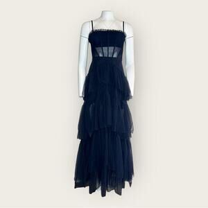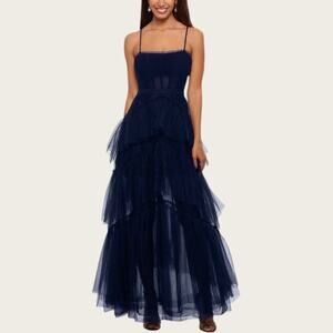 NWT | Betsy & Adam | Jasmine Long Corset Tiered Mesh Illusion Gown | Navy | 8