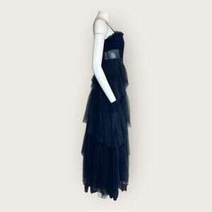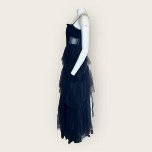 Skirt: Tiered, full-length tulle skirt with multiple layers, creating a voluminous and dramatic effect