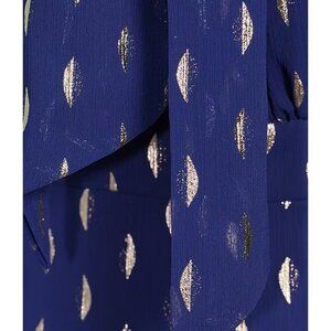Ruffle detail at skirt; allover foil detail; self-tie bow at back of neck
