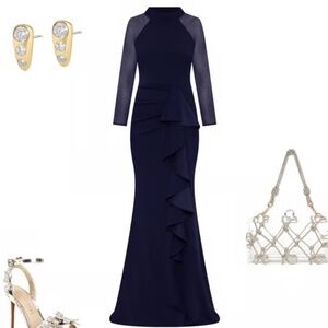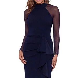 NWT Betsy & Adam Mock Neck Illusion Long Sleeve Ruffled Scuba Crepe Mesh Gown 4P
