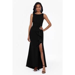 Betsy & Adam Women's Petite Black Scuba Crepe Gown, Size 6P – Features a sleeveless boat neck design with ruffle detail and side slit for an elegant silhouette.