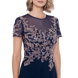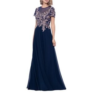 NWT Betsy & Adam Wendy Short Cap Sleeve Beaded Applique Gown in Navy/Rose Gold 6