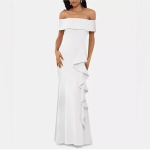 NWT Betsy & Adam White Off Shoulder Ruffle Maxi Sheath Mermaid Gown