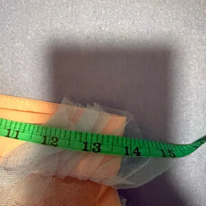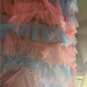 Elegant sheer skirt with layered ruffles of tulle. Features pastel pink and blue hues. Perfect for special occasions.