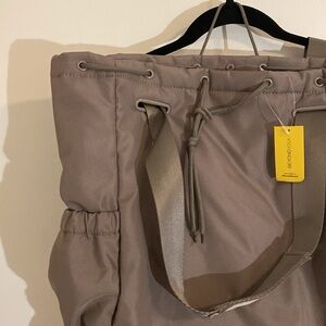 Stylish taupe tote bag by Beyond Yoga. Features a spacious design with sturdy handles.