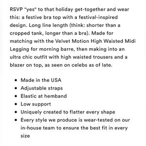 RSVP "yes" to that holiday get-together and wear this: a festive bra top with a festival-inspired design. Long line length (think: shorter than a cropped tank, longer than a bra). Made for matching with the Velvet Motion High Waisted Midi Legging for morning barre, then making into an ultra chic outfit with high waisted trousers and a blazer on top, as seen on celebs as of late.