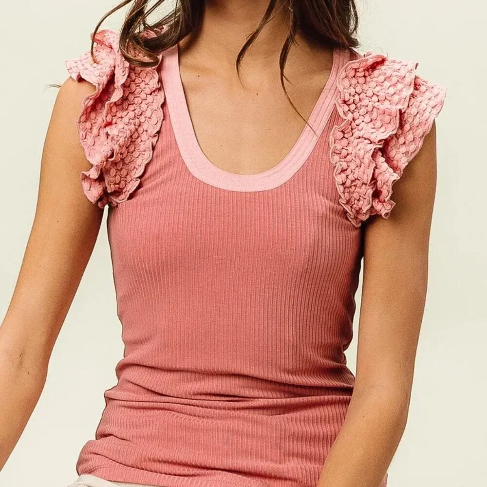 ✨NWT BiBi Rib Knit With Textured Ruffled Top